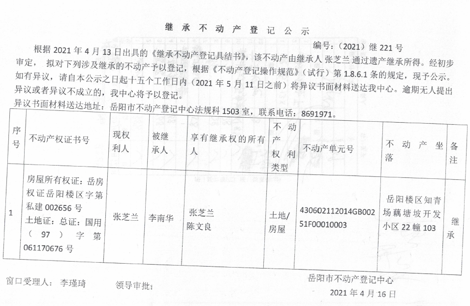 继承不动产登记公示 编号:(2021)继221号(张芝兰)