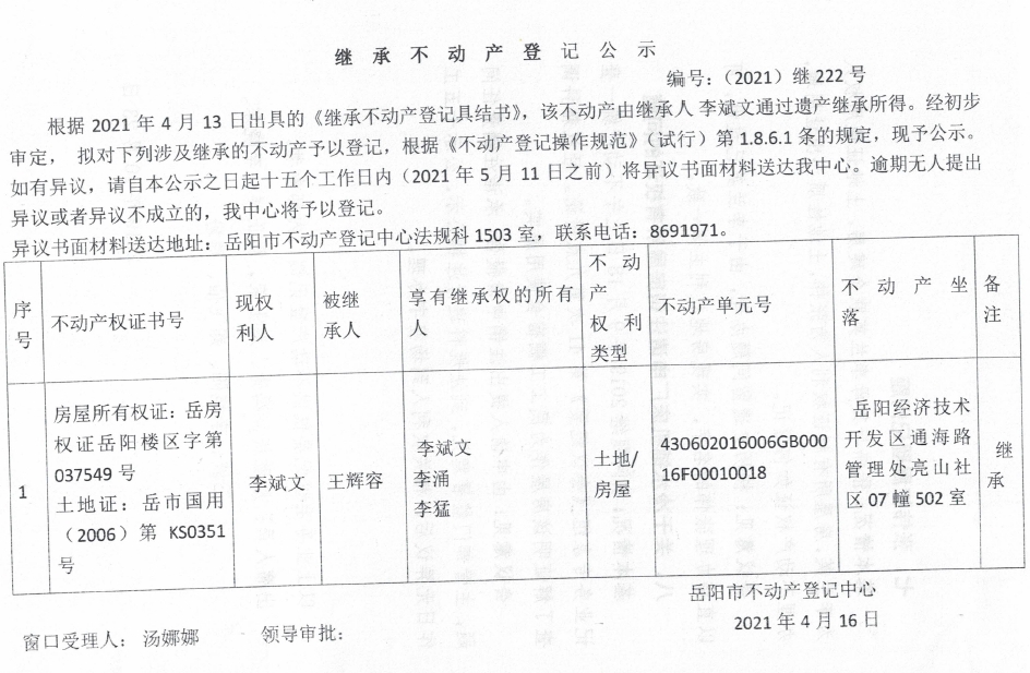 继承不动产登记公示 编号:(2021)继222号(李斌文)