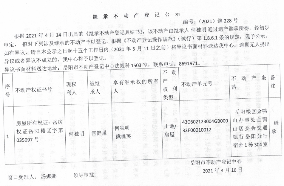 继承不动产登记公示 编号:(2021)继228(何独明)