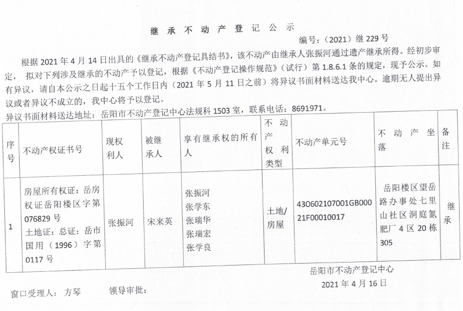 继承不动产登记公示 编号:(2021)继229(张振河)