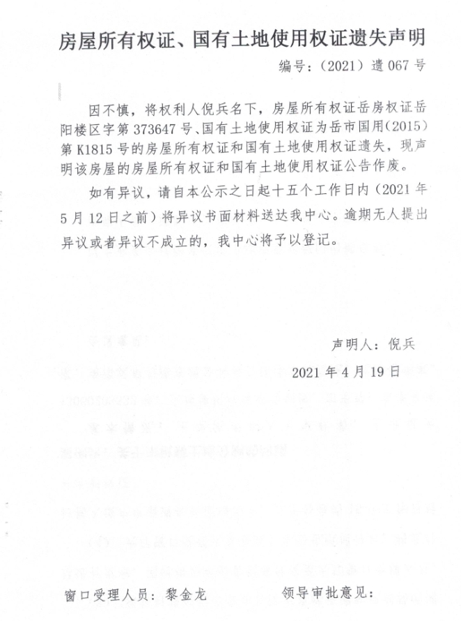 权证遗失声明 编号:(2021)遗067号(倪兵)