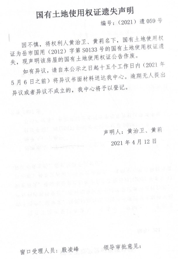 国有土地使用权证遗失声明 编号:(2021)遗059号(黄治卫、黄莉)