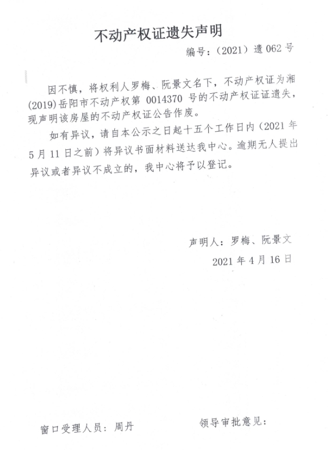 不动产权证遗失声明 编号:(2021)遗062号(罗梅、阮景文)