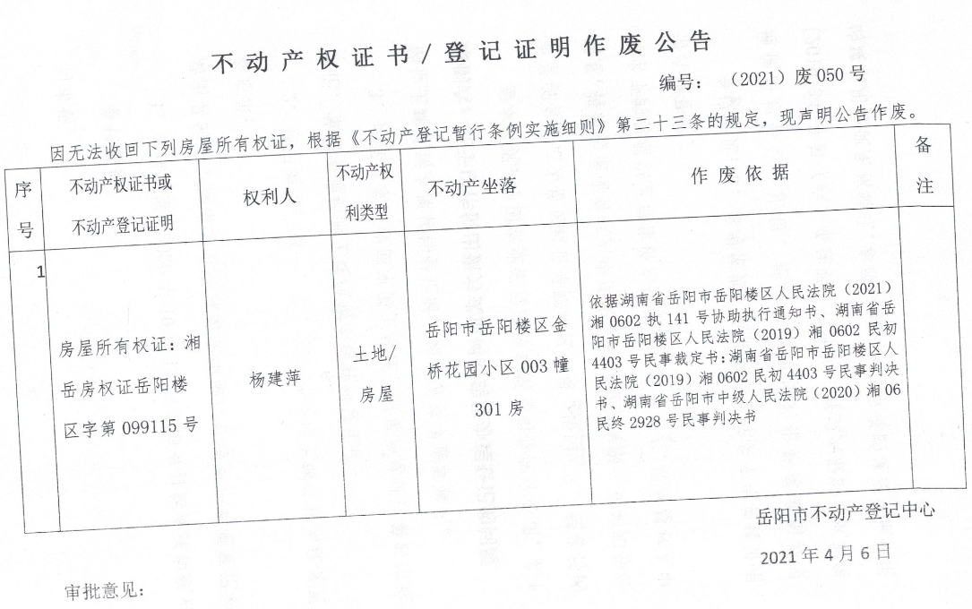 不动产权证书、登记证明作废公告 编号: (2021)废050号(杨建萍)