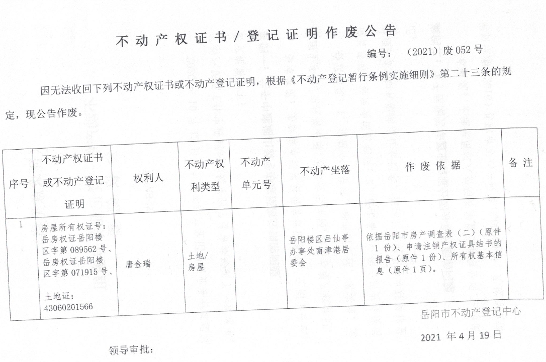 不动产权证书、登记证明作废公告 编号: (2021)废052号(唐金瑞)