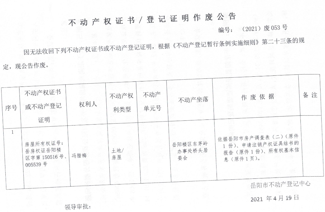 不动产权证书、登记证明作废公告 编号: (2021)废053号(冯腊梅)