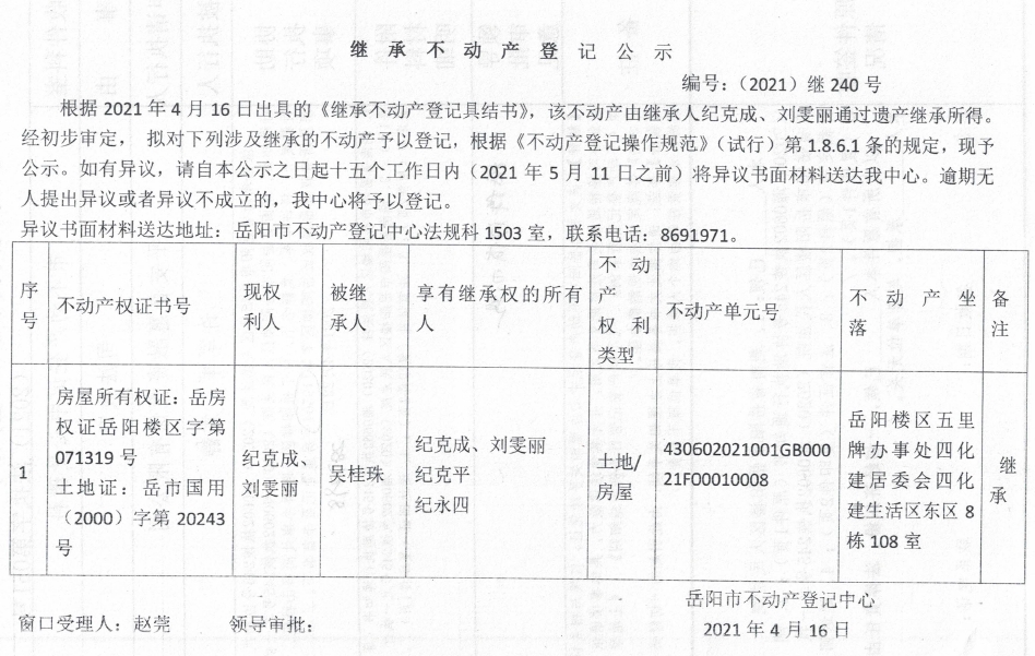 继承不动产登记公示 编号:(2021)继240(刘雯丽)