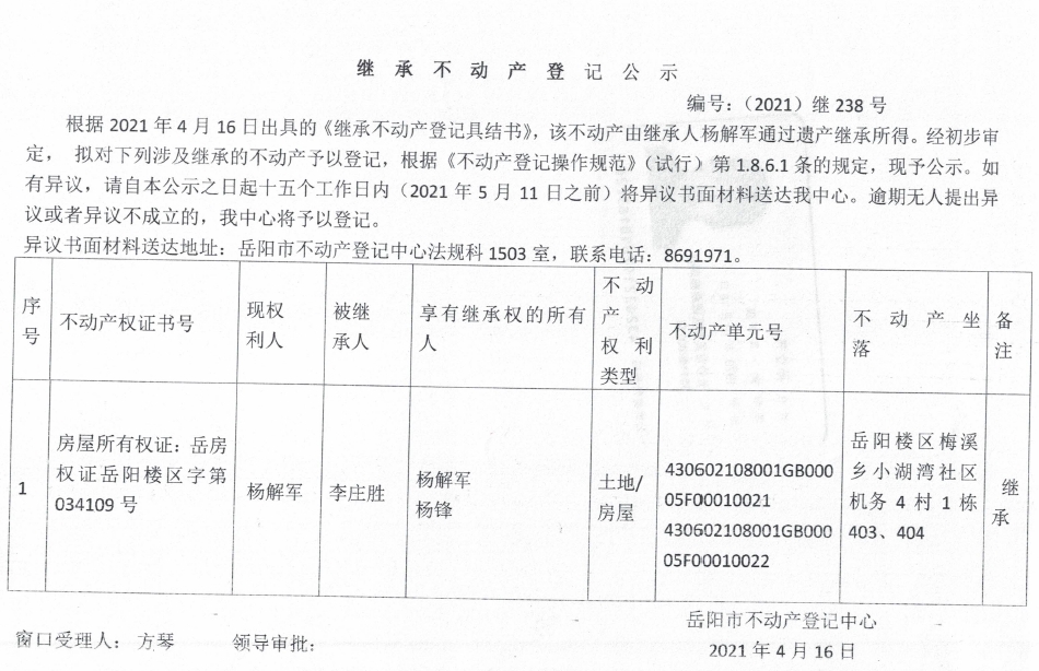 继承不动产登记公示 编号:(2021)继238(杨解军)