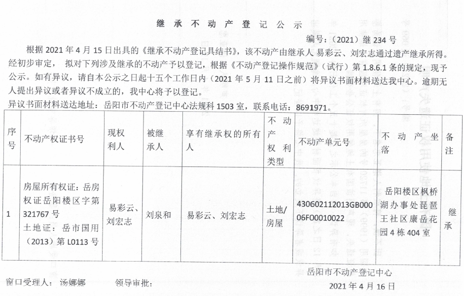 继承不动产登记公示 编号:(2021)继234(易彩云)