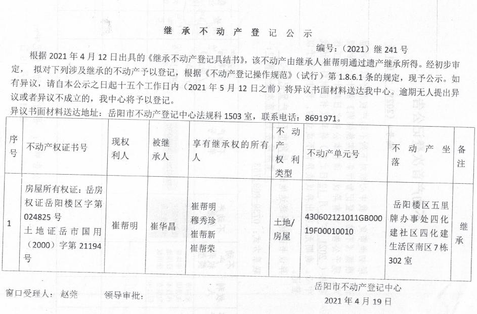 继承不动产登记公示 编号:(2021)继241(崔帮明)