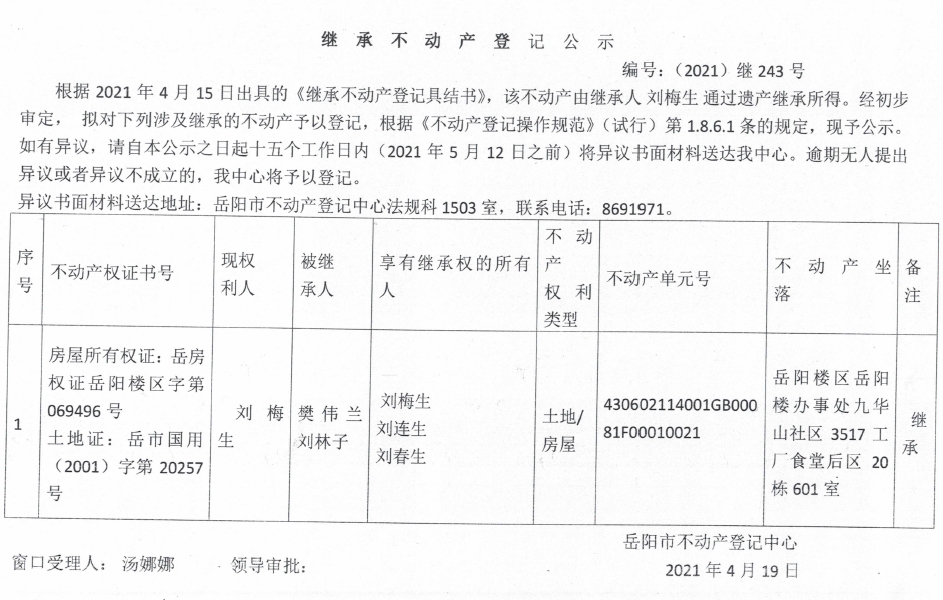 继承不动产登记公示 编号:(2021)继243(刘梅生)