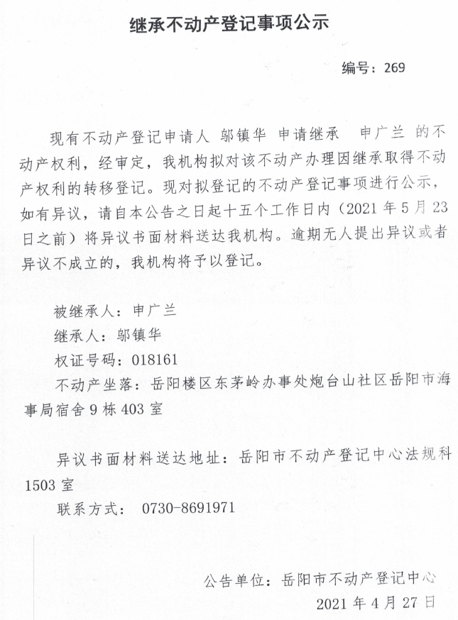 继承不动产登记公示 编号:(2021)继269(邬镇华)
