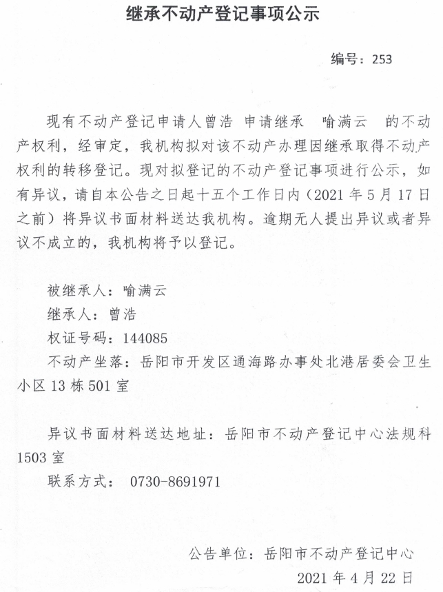 继承不动产登记公示 编号:(2021)继253(曾浩)