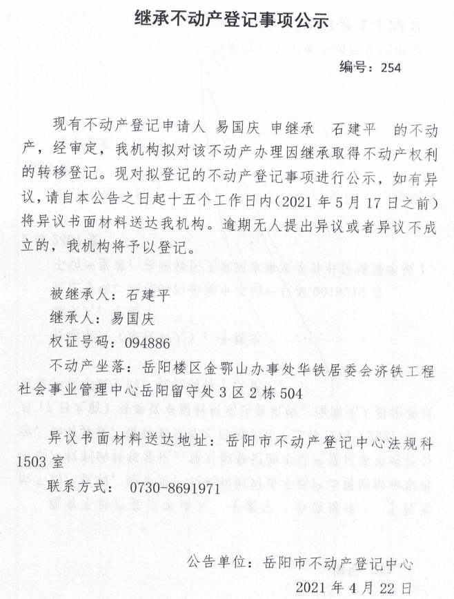 继承不动产登记公示 编号:(2021)继254(易国庆)