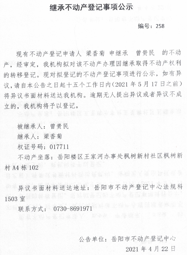 继承不动产登记公示 编号:(2021)继258(梁香菊)