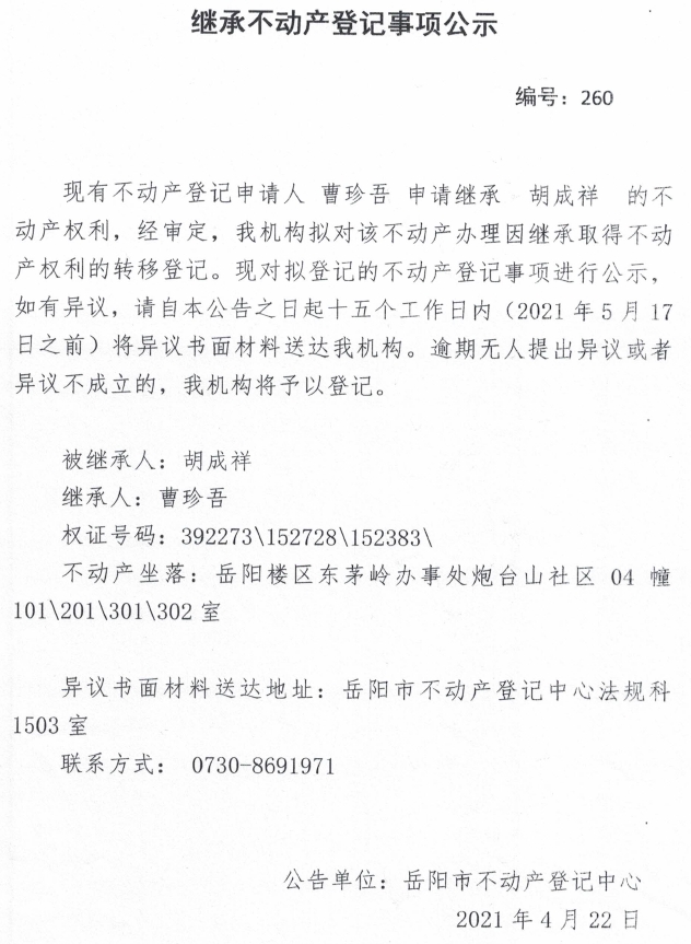 继承不动产登记公示 编号:(2021)继260(曹珍吾)