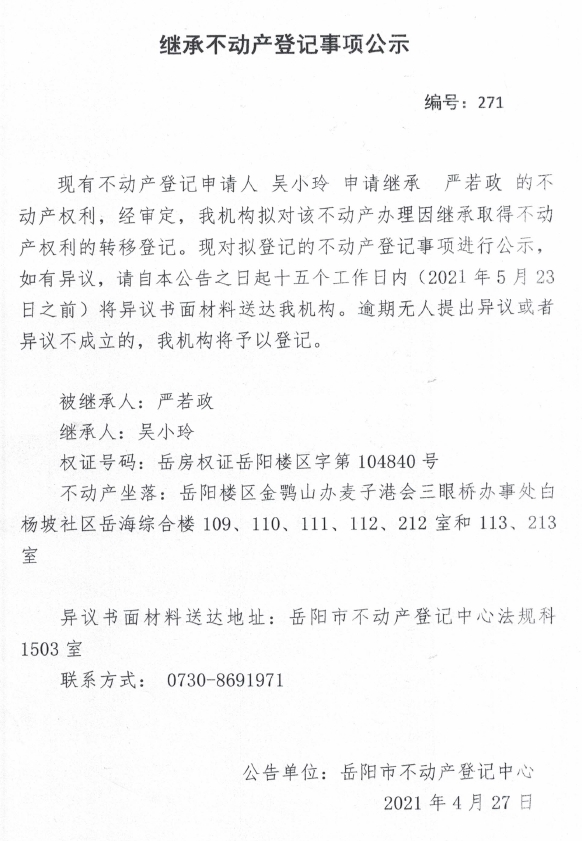 继承不动产登记公示 编号:(2021)继271(吴小玲)