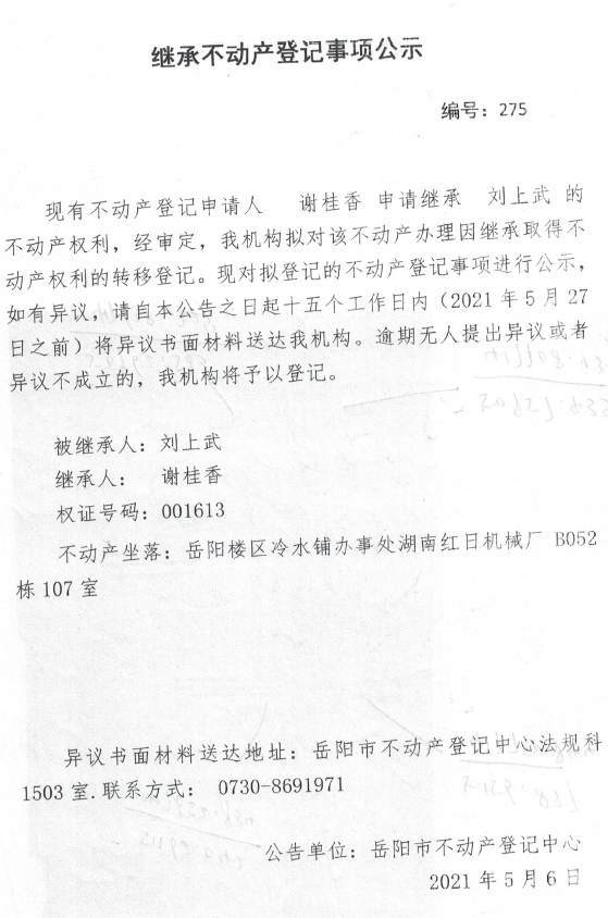 继承不动产登记公示 编号:(2021)继275(谢桂香)