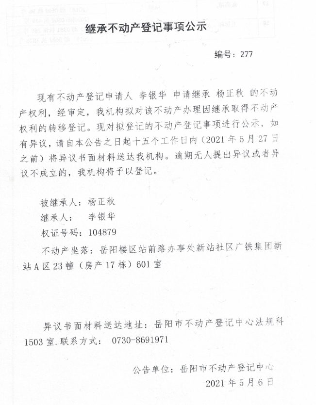 继承不动产登记公示 编号:(2021)继277(杨正秋)