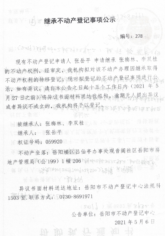 继承不动产登记公示 编号:(2021)继278(张岳平)
