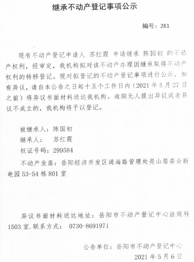 继承不动产登记公示 编号:(2021)继281(苏红霞)