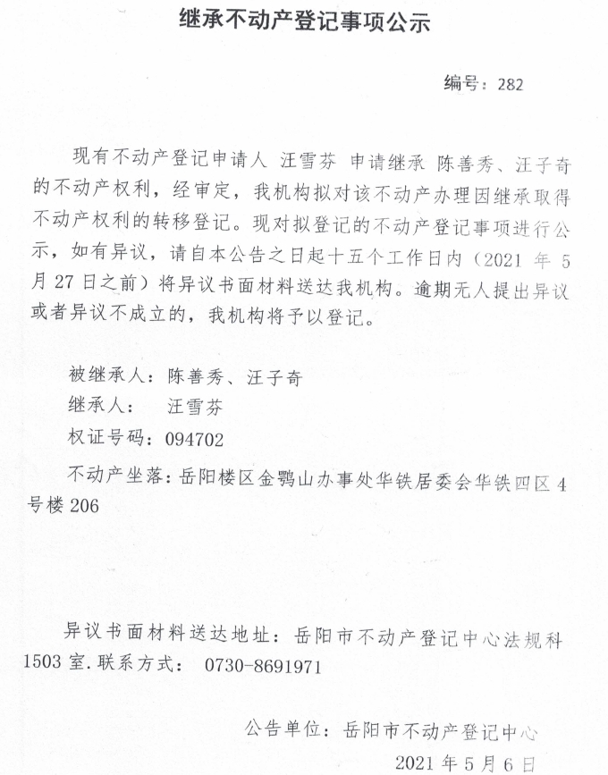 继承不动产登记公示 编号:(2021)继282(汪雪芬)