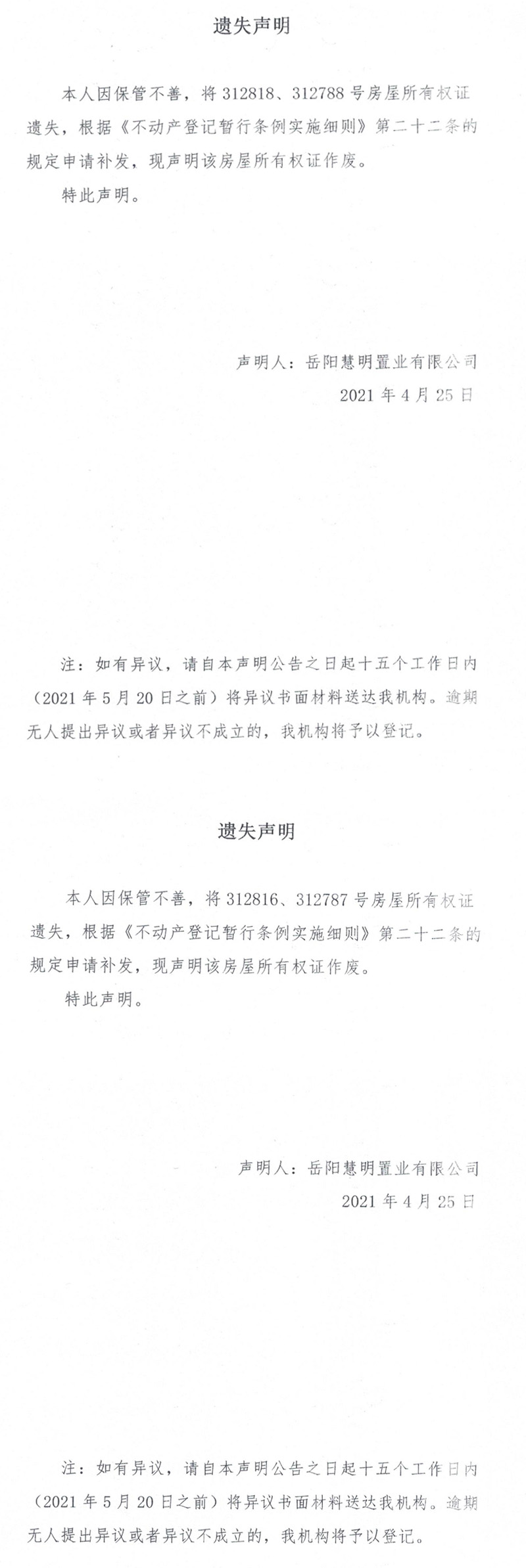 遗失声明(岳阳慧明置业有限公司)