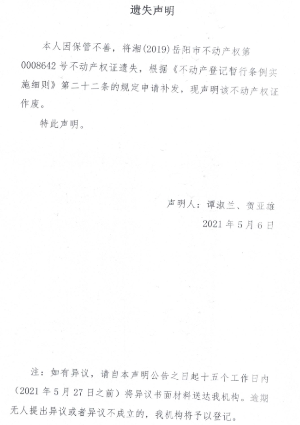 遗失声明(谭淑兰、贺亚雄)