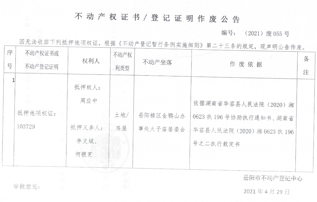 不动产权证书、登记证明作废公告 编号: (2021)废055号(抵押权人周应中;抵押义务人李文斌、何银芝)