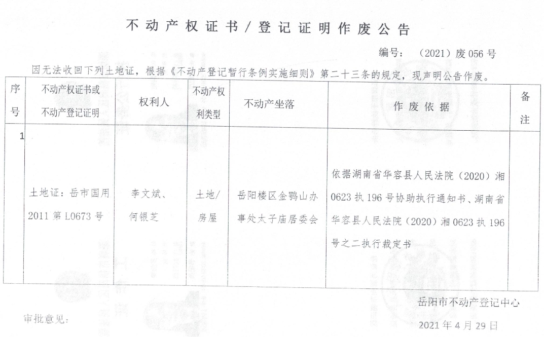 不动产权证书、登记证明作废公告 编号: (2021)废056号(李文斌、何银芝)