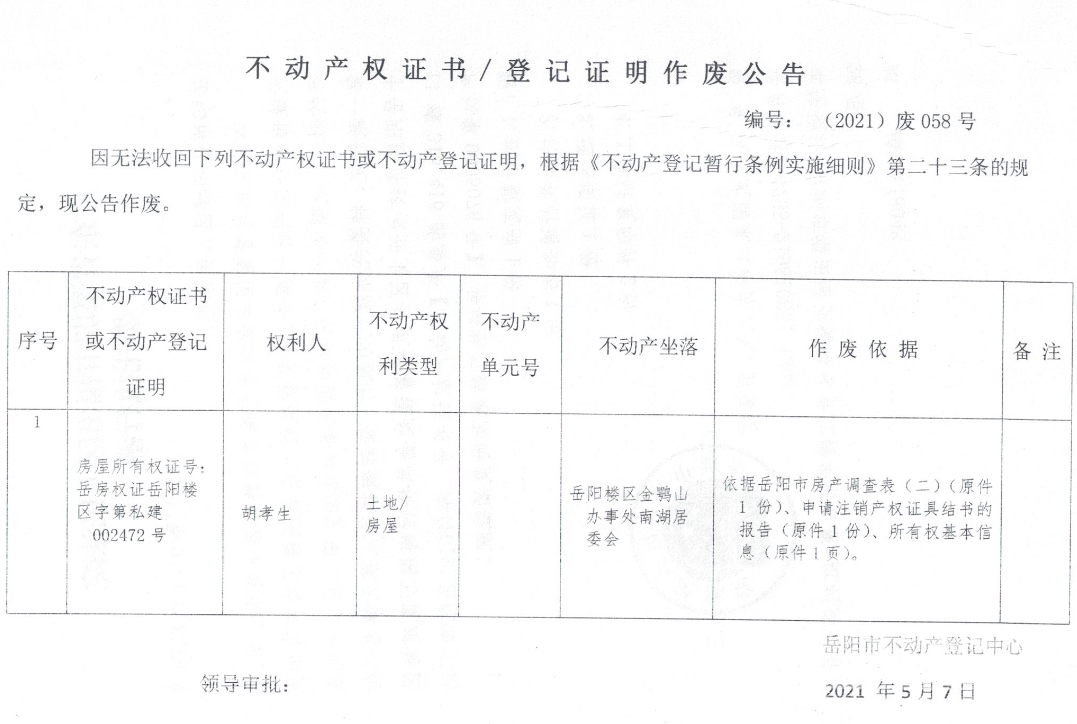 不动产权证书、登记证明作废公告 编号: (2021)废058号(胡孝生)