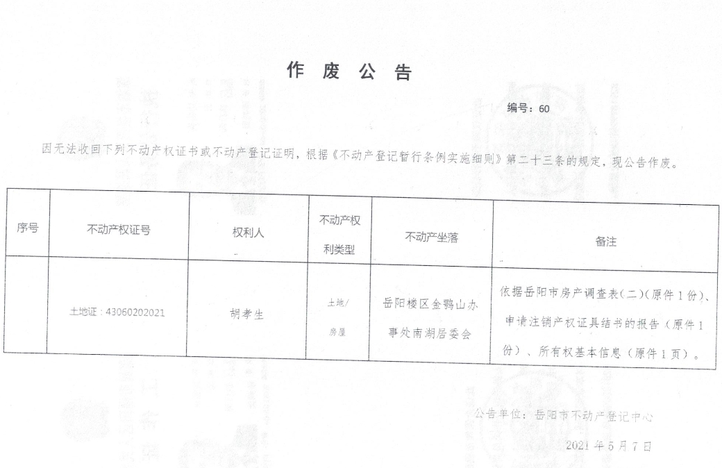 不动产权证书、登记证明作废公告 编号: (2021)废60号(胡孝生)