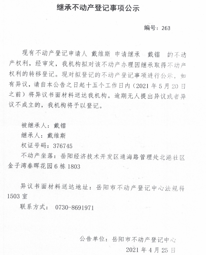 继承不动产登记公示 编号:(2021)继263(戴维斯)