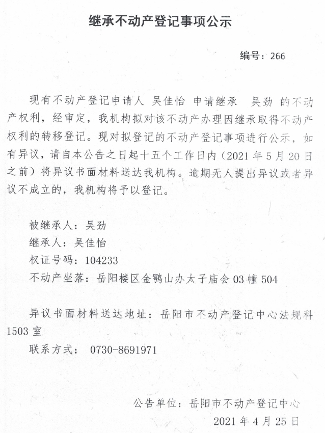 继承不动产登记公示 编号:(2021)继266(吴佳怡)