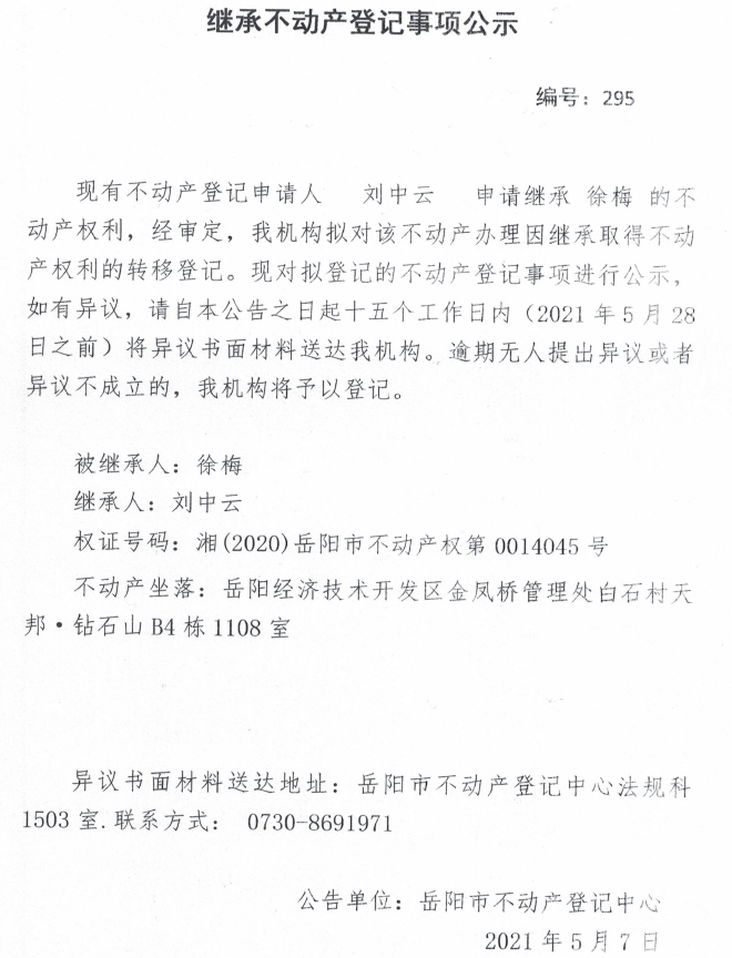 继承不动产登记公示 编号:(2021)继295(刘中云)