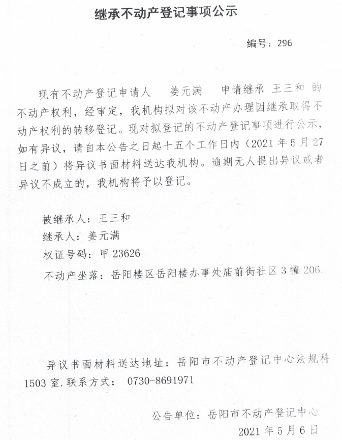 继承不动产登记公示 编号:(2021)继296(姜元满)