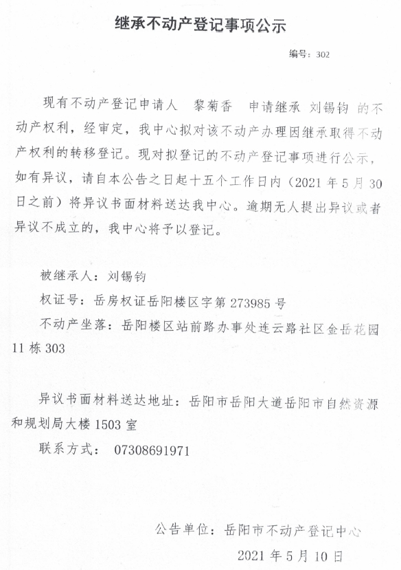 继承不动产登记公示 编号:(2021)继302(黎菊香)