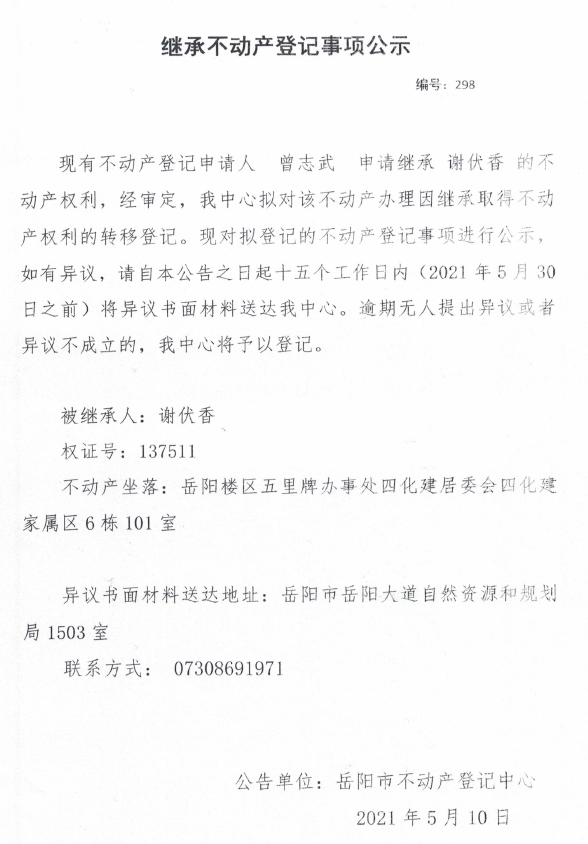 继承不动产登记公示 编号:(2021)继298(曾志武)