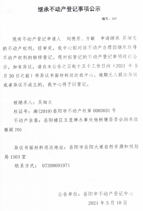 继承不动产登记公示 编号:(2021)继297(刘德芳)