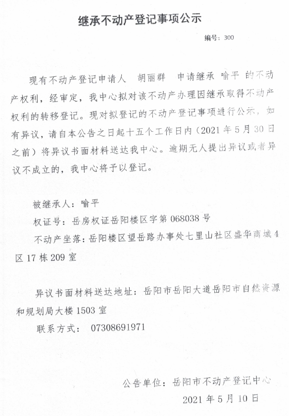 继承不动产登记公示 编号:(2021)继300(胡丽群)