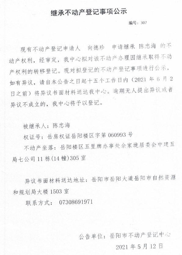 继承不动产登记公示 编号:(2021)继307(向德珍)