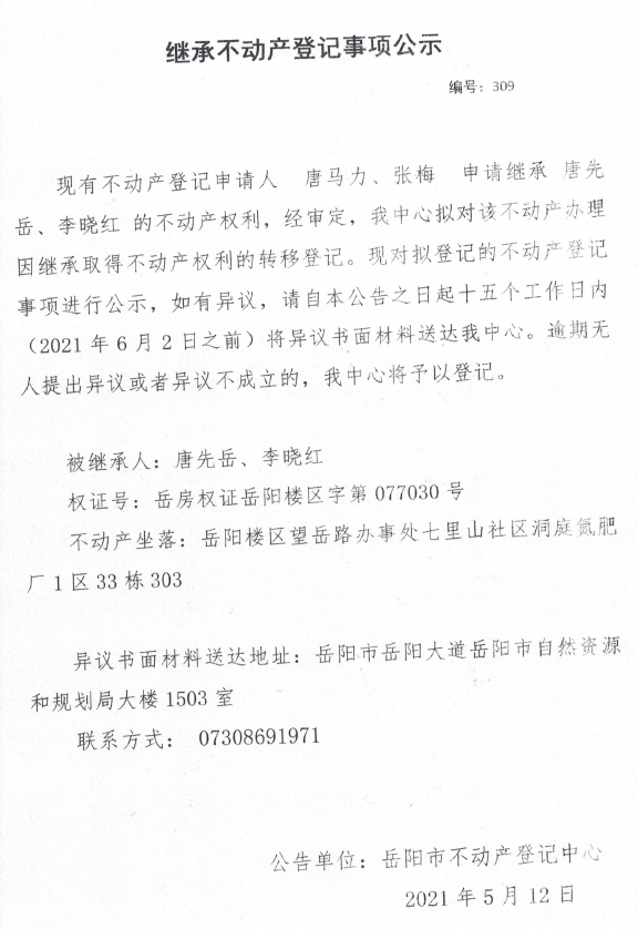 继承不动产登记公示 编号:(2021)继309(唐先岳)