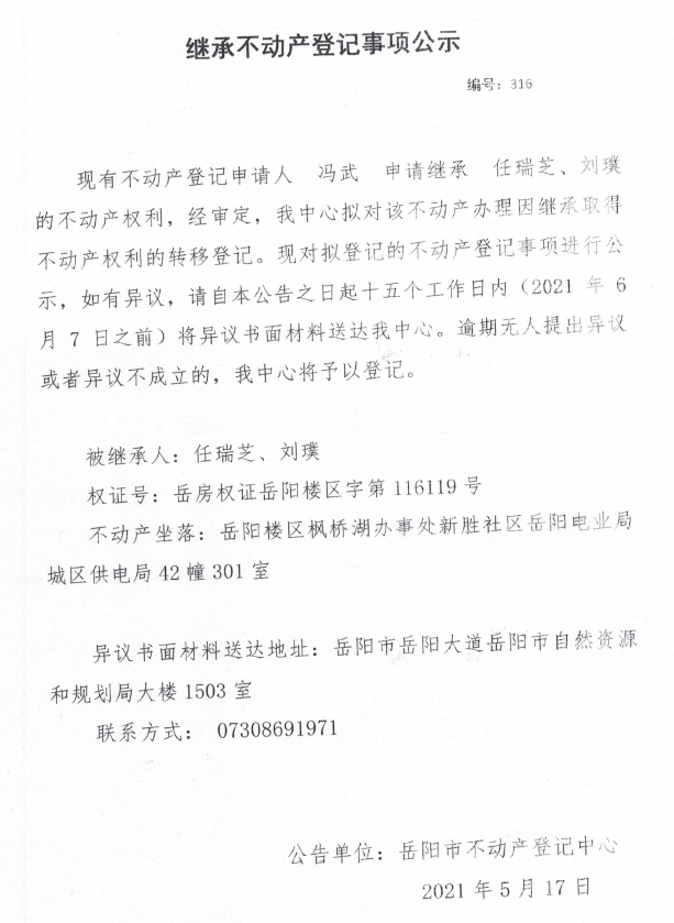 继承不动产登记公示 编号:(2021)继316(冯武)