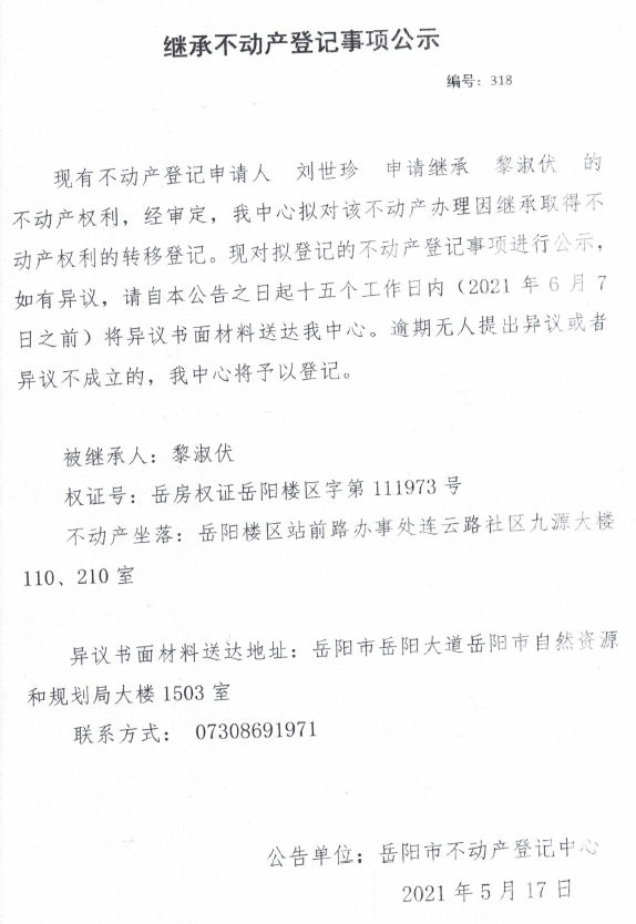 继承不动产登记公示 编号:(2021)继318(黎淑伏)