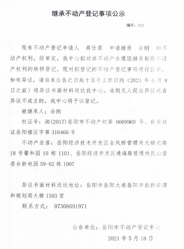继承不动产登记公示 编号:(2021)继322(蒋仕蓉)