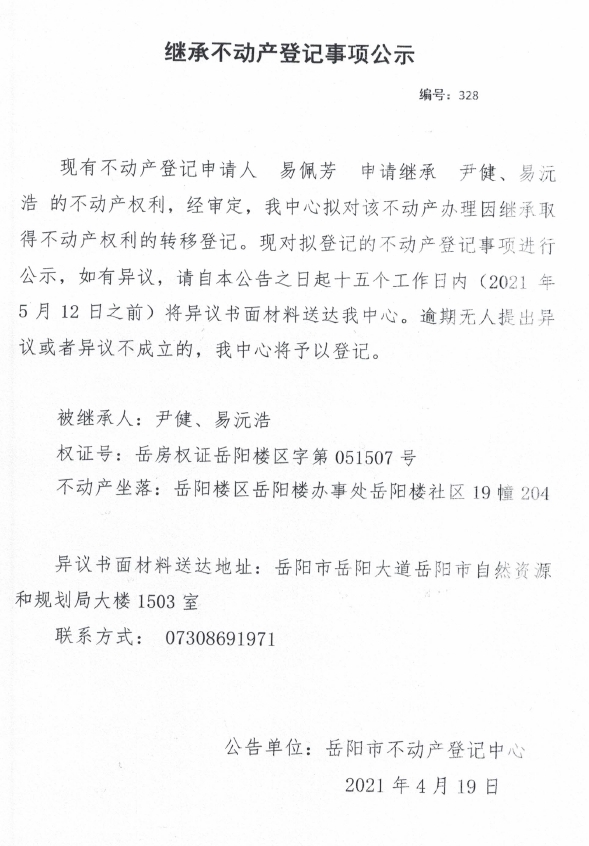 继承不动产登记公示 编号:(2021)继328(易佩芳)