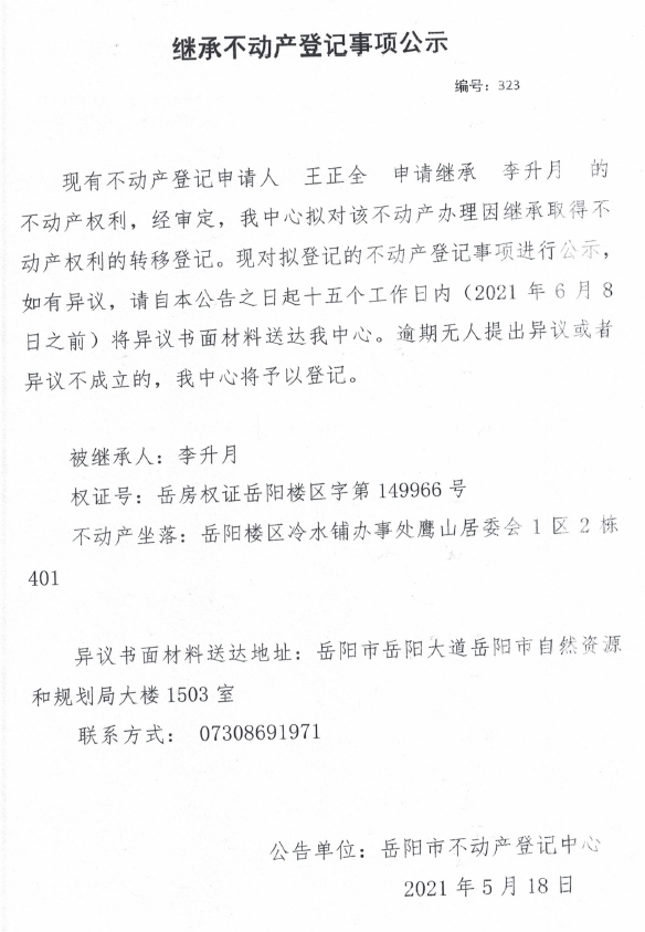 继承不动产登记公示 编号:(2021)继323(王正全)