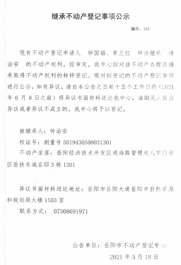 继承不动产登记公示 编号:(2021)继326(钟国福)
