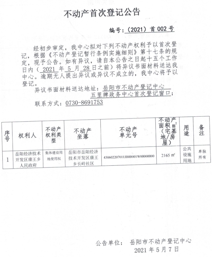 不动产首次登记公告 编号:(2021)首002号(岳阳经济技术开发区康王乡人民政府)