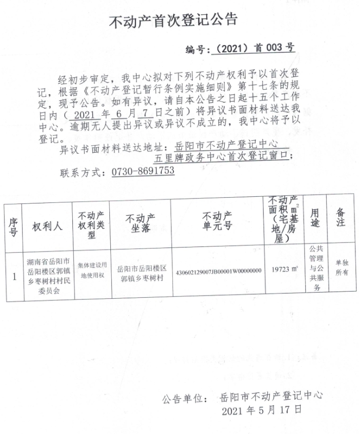 不动产首次登记公告 编号:(2021)首003号 (湖南省岳阳市岳阳楼区郭镇乡枣树村村民委员会)